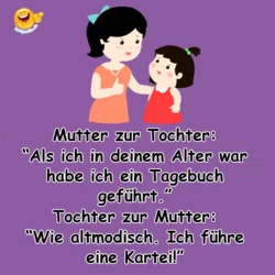 Mutter zur Tochter: “Als ich in deinem Alter war habe ich ein Tagebuch geführt.” Tochter zur Mutter: “Wie altmodisch. Ich führe eine Kartei!”