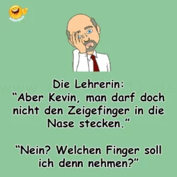 Die Lehrerin:“Aber Kevin, man darf doch nicht den Zeigefinger in die Nase stecken.” “Nein? Welchen Finger soll ich denn nehmen?”