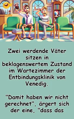 Zwei werdende Väter sitzen in beklagenswertem Zustand im Wartezimmer der Entbindungsklinik von Venedig. „Damit haben wir nicht gerechnet“, ärgert sich ..