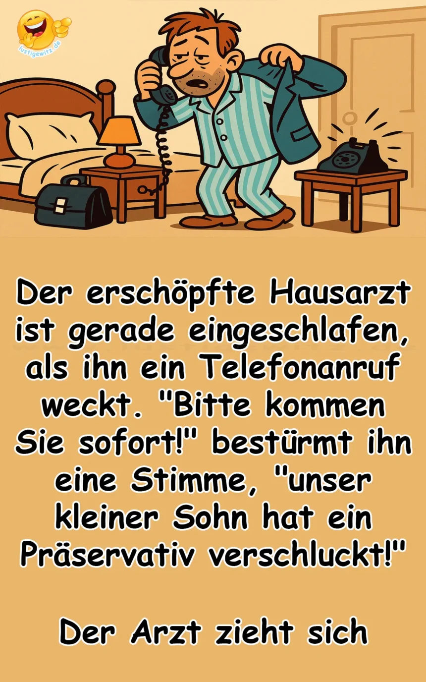 Der erschöpfte Hausarzt ist gerade eingeschlafen, als ihn ein Telefonanruf weckt. „Bitte kommen Sie sofort!“ bestürmt ihn eine Stimme, „unser kleiner Sohn hat ein Präservativ verschluckt!“