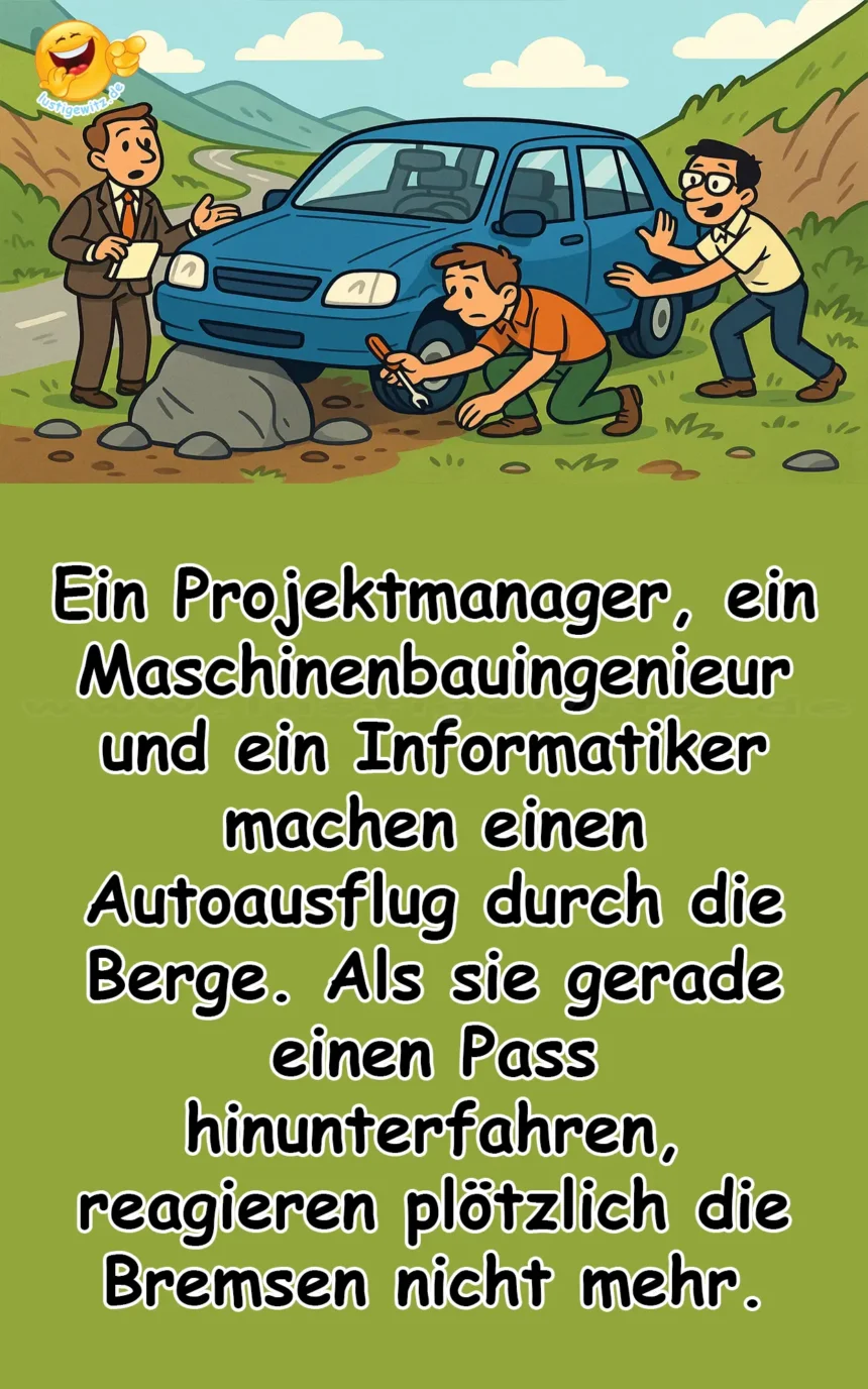 Ein Projektmanager, ein Maschinenbauingenieur und ein Informatiker machen einen Autoausflug durch die Berge. Als sie gerade einen Pass hinunterfahren, reagieren plötzlich die Bremsen nicht mehr.