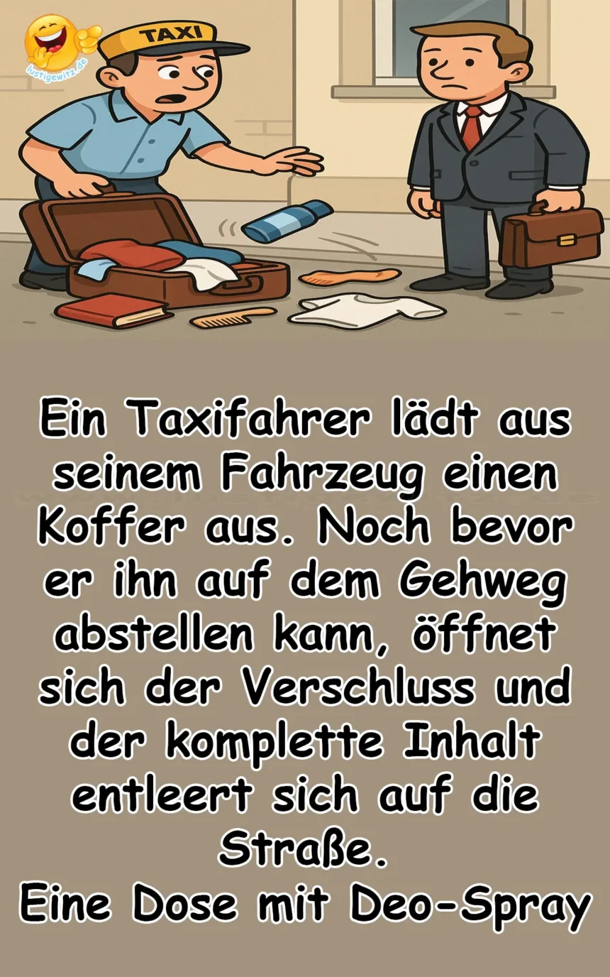 Eine Dose mit Deo-Spray rollt ein paar Meter die Straße hinunter und wird von einem Finanzbeamten mit dem Fuß gestoppt. Als der Taxifahrer die Dose aufheben will, schaut ihn der Finanzbeamte mitleidig an und fragt: