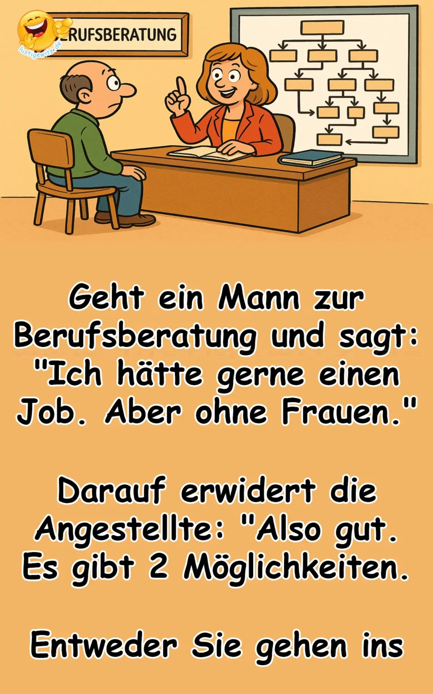 Geht ein Mann zur Berufsberatung und sagt: „Ich hätte gerne einen Job. Aber ohne Frauen.“