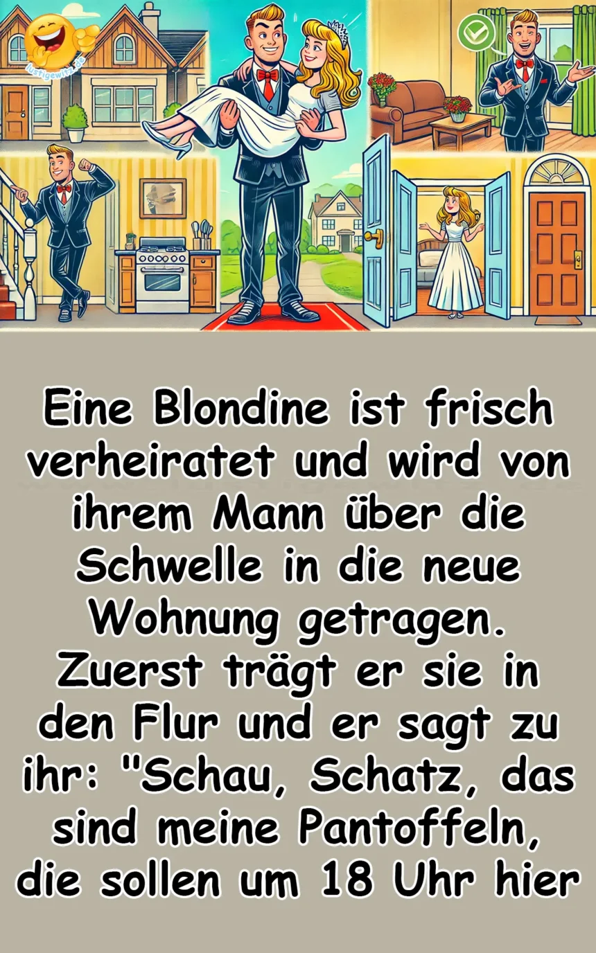 Eine Blondine ist frisch verheiratet und wird von ihrem Mann über die Schwelle in die neue Wohnung getragen. Zuerst trägt er sie in den Flur und er sagt zu ihr: „Schau, Schatz, das sind meine Pantoffeln, die sollen um 18 Uhr hier immer stehen, egal, ob ich da bin oder nicht.“