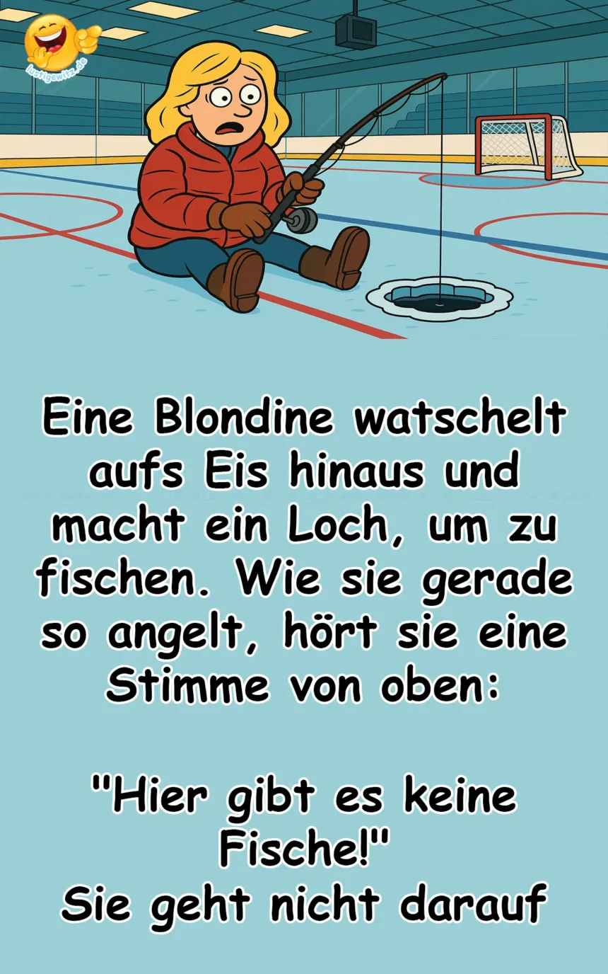 Eine Blondine watschelt aufs Eis hinaus und macht ein Loch, um zu fischen. Wie sie gerade so angelt, hört sie eine Stimme von oben: