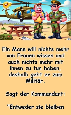 Ein Mann will nichts mehr von Frauen wissen und auch nichts mehr mit ihnen zu tun haben, deshalb geht er zum Militär. Sagt der Kommandant: „Entweder sie bleiben ..