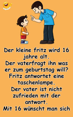 Der kleine fritz wird 16 jahre alt. Der vaterfragt ihn was er zum geburtstag will? Fritz antwortet eine taschenlampe. Der vater ist nicht zufrieden mit der antwort. ..