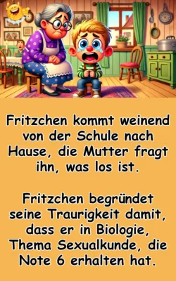 Fritzchen kommt weinend von der Schule nach Hause, die Mutter fragt ihn, was los ist. Fritzchen begründet seine Traurigkeit damit, dass er in Biologie, Thema Sexualkunde, ..