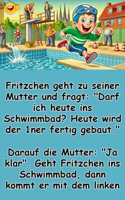 Fritzchen geht zu seiner Mutter und fragt: „Darf ich heute ins Schwimmbad? Heute wird der 1ner fertig gebaut.“ Darauf die Mutter: „Ja klar“. ..