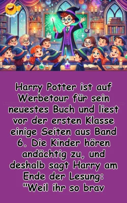 Harry Potter ist auf Werbetour für sein neuestes Buch und liest vor der ersten Klasse einige Seiten aus Band 6. Die Kinder hören andächtig zu, und deshalb sagt ..