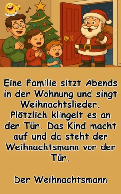 Eine Familie sitzt Abends in der Wohnung und singt Weihnachtslieder. Plötzlich klingelt es an der Tür. Das Kind macht auf und da steht der Weihnachtsmann vor der Tür. ..