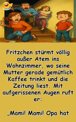 Fritzchen stürmt völlig außer Atem ins Wohnzimmer, wo seine Mutter gerade gemütlich Kaffee trinkt und die Zeitung liest. Mit aufgerissenen Augen ruft er: „Mami! ..