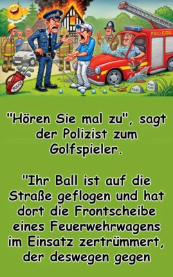 „Hören Sie mal zu“, sagt der Polizist zum Golfspieler. „Ihr Ball ist auf die Straße geflogen und hat dort die Frontscheibe eines Feuerwehrwagens ..