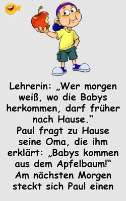 Lehrerin: „Wer morgen weiß, wo die Babys herkommen, darf früher nach Hause.“ Paul fragt zu Hause seine Oma, die ihm erklärt: „Babys kommen aus dem Apfelbaum!“ ..
