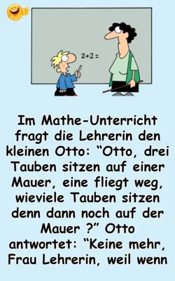 Im Mathe-Unterricht fragt die Lehrerin den kleinen Otto: “Otto, drei Tauben sitzen auf einer Mauer, eine fliegt weg, wieviele Tauben sitzen denn dann noch auf der Mauer ..