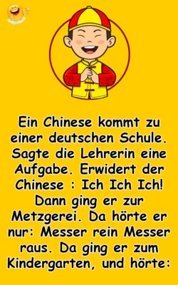Ein Chinese kommt zu einer deutschen Schule. Sagte die Lehrerin eine Aufgabe. Erwidert der Chinese : Ich Ich Ich! Dann ging er zur Metzgerei. Da hörte er nur: Messer ..
