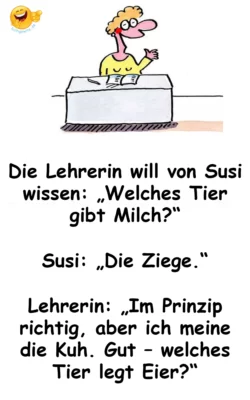 Die Lehrerin will von Susi wissen: „Welches Tier gibt Milch?“ Susi: „Die Ziege.“ Lehrerin: „Im Prinzip richtig, aber ich meine die Kuh. ..