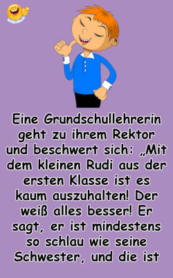 Eine Grundschullehrerin geht zu ihrem Rektor und beschwert sich: „Mit dem kleinen Rudi aus der ersten Klasse ist es kaum auszuhalten! Der weiß alles besser! ..