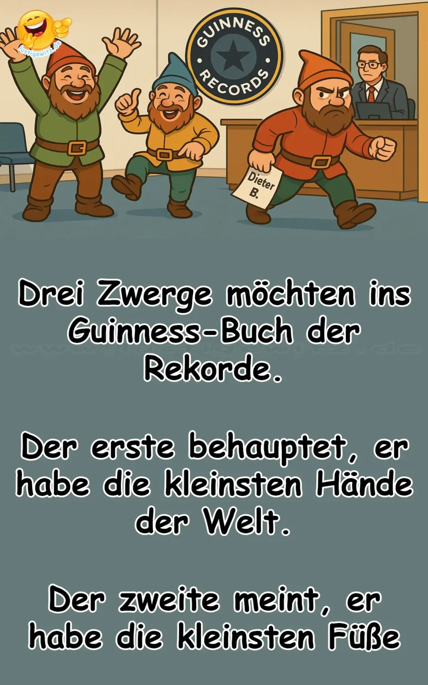 Also machen sich alle drei auf zum Guinness-Büro. Der erste Zwerg geht rein und kommt nach ein paar Minuten jubelnd zurück: „Ich hab den Rekord, ich habe wirklich die kleinsten Hände der Welt!“