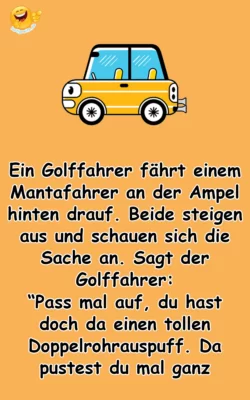 … Da pustest du mal ganz kräftig rein und dann beult sich die Delle von allein aus.” Sagt der Mantafahrer: “Gute Idee, ey.” Der Golffahrer fährt weiter ..