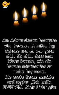 … Die erste Kerze seufzte und sagte: „Ich heiße FRIEDEN. Mein Licht gibt Sicherheit, doch auf der Welt gibt es so viele Kriege. Die Menschen wollen ..