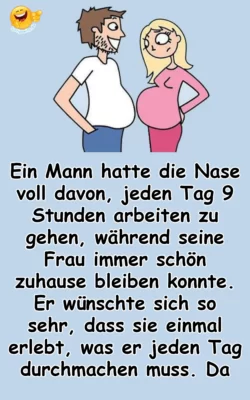 Ein Mann hatte die Nase voll davon, jeden Tag 9 Stunden arbeiten zu gehen, während seine Frau immer schön zuhause bleiben konnte. Er wünschte sich so sehr, dass ..