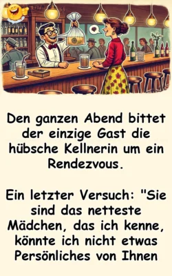 Den ganzen Abend bittet der einzige Gast die hübsche Kellnerin um ein Rendezvous. Ein letzter Versuch: „Sie sind das netteste Mädchen, das ich kenne, könnte ..