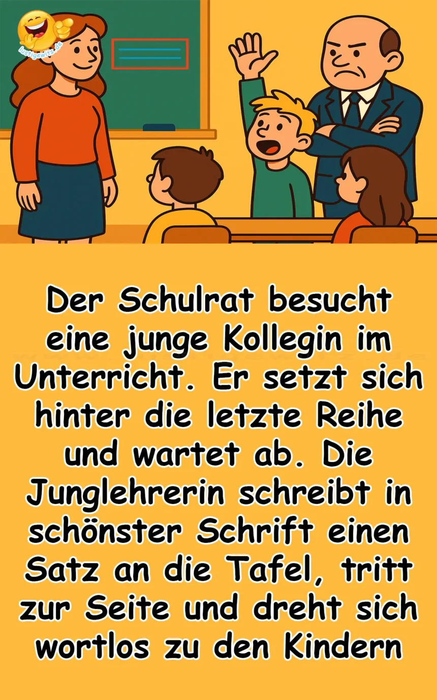 Der Schulrat besucht eine junge Kollegin im Unterricht. Er setzt sich hinter die letzte Reihe und wartet ab. Die Junglehrerin schreibt in schönster Schrift einen Satz an die Tafel, tritt zur Seite und dreht sich wortlos zu den Kindern um. Alle schauen zur Tafel. Stille, keiner sagt etwas. Die Lehrerin dreht sich zur Tafel um, nimmt ein Lineal und unterstreicht den Satz mit blauer Kreide. Sie dreht sich wieder zu den Kindern um, wartet. Wieder kein Finger oben. Abermals dreht sich die junge Frau um und macht mit roter Kreide einen Kasten um den Satz. Sie wendet sich den Kindern zu und fragt: „Nun?“