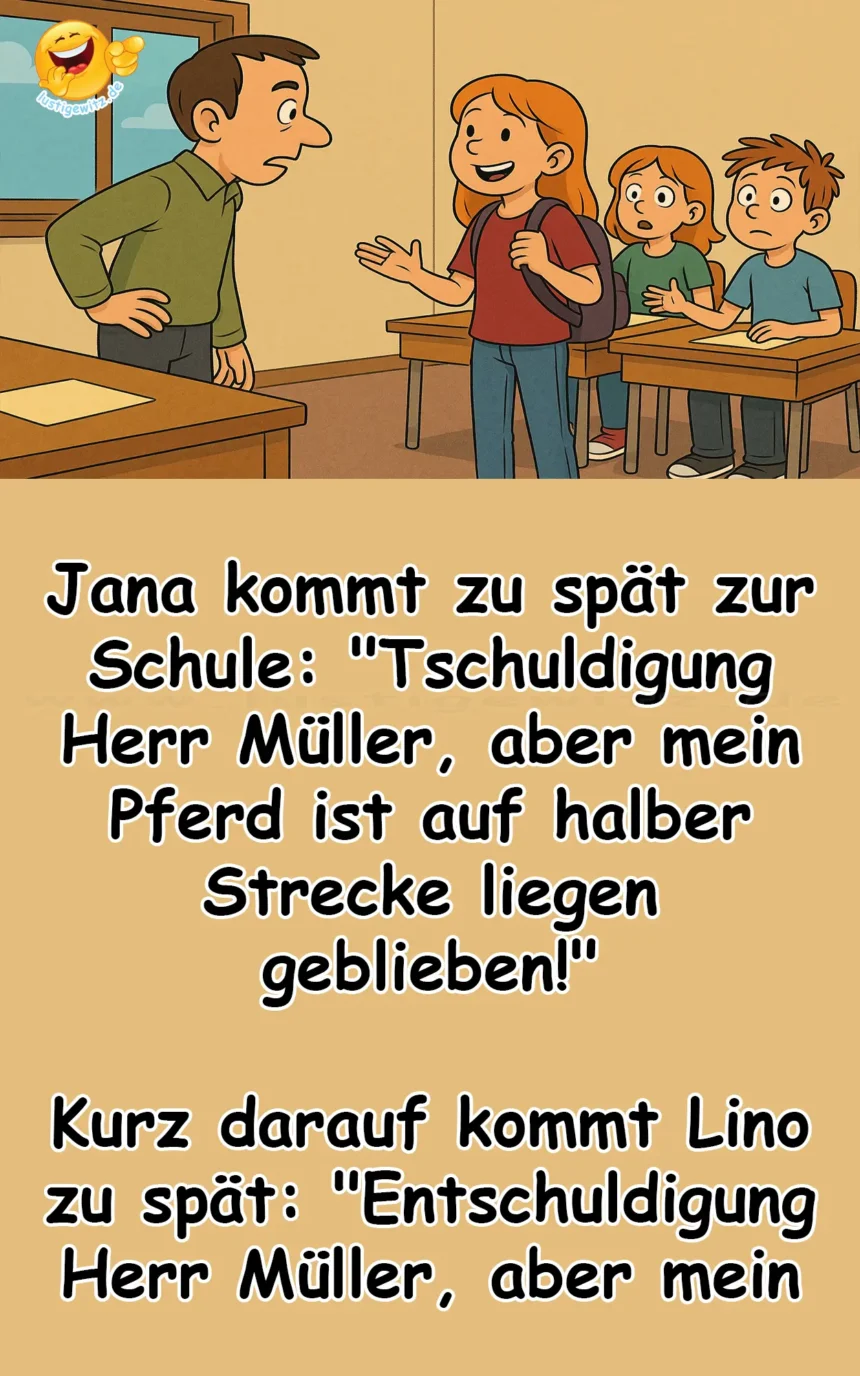 Jana kommt zu spät zur Schule: „Tschuldigung Herr Müller, aber mein Pferd ist auf halber Strecke liegen geblieben!“