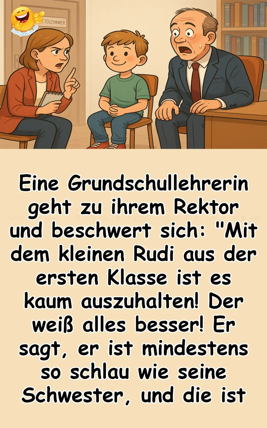 Eine Grundschullehrerin geht zu ihrem Rektor und beschwert sich: „Mit dem kleinen Rudi aus der ersten Klasse ist es kaum auszuhalten! Der weiß alles besser! Er sagt, er ist mindestens so schlau wie seine Schwester, und die ist schon in der dritten Klasse. Jetzt will er auch in die dritte Klasse gehen!“