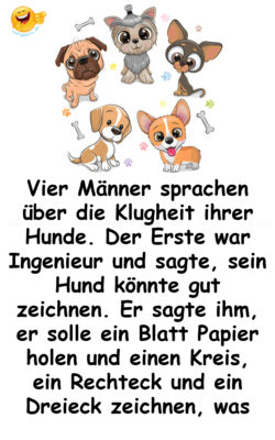 Vier Männer sprachen über die Klugheit ihrer Hunde. Der Erste war Ingenieur und sagte, sein Hund könnte gut zeichnen. Er sagte ihm, er solle ein Blatt Papier ..