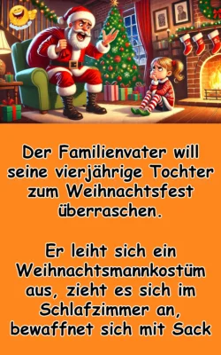 Der Familienvater will seine vierjährige Tochter zum Weihnachtsfest überraschen. Er leiht sich ein Weihnachtsmannkostüm aus, zieht es sich im Schlafzimmer an, bewaffnet ..