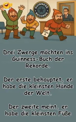 Drei Zwerge möchten ins Guinness-Buch der Rekorde. Der erste behauptet, er habe die kleinsten Hände der Welt. Der zweite meint, er habe die kleinsten Füße der Welt. ..