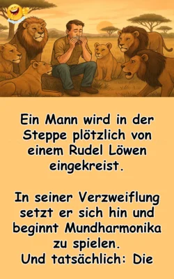 Ein Mann wird in der Steppe plötzlich von einem Rudel Löwen eingekreist. In seiner Verzweiflung setzt er sich hin und beginnt Mundharmonika zu spielen. Und tatsächlich: ..